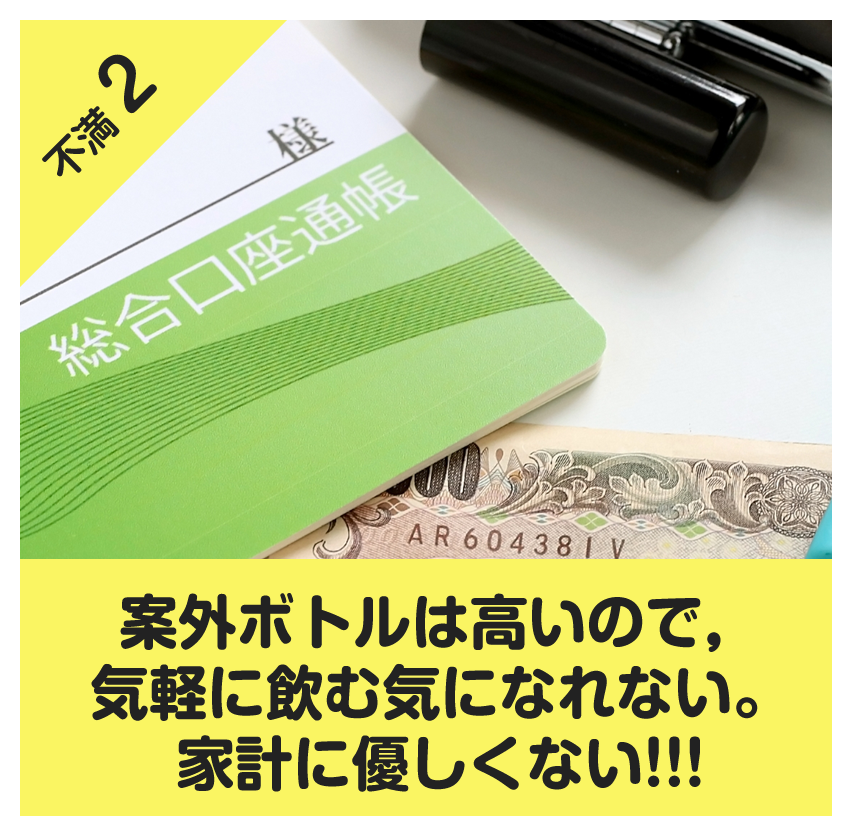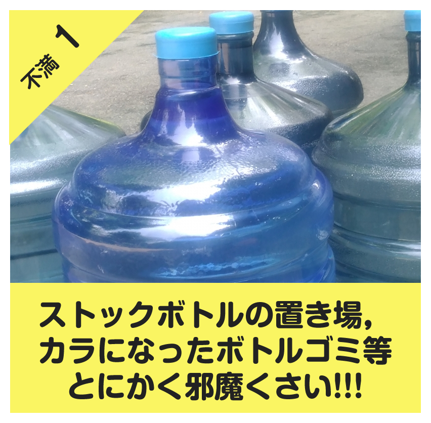 あの面倒な重たいボトル交換作業は二度といりません。また,邪魔臭い空っぽになったボトルゴミの置き場,在庫のボトルを置くスペースもいらなくなるのです。